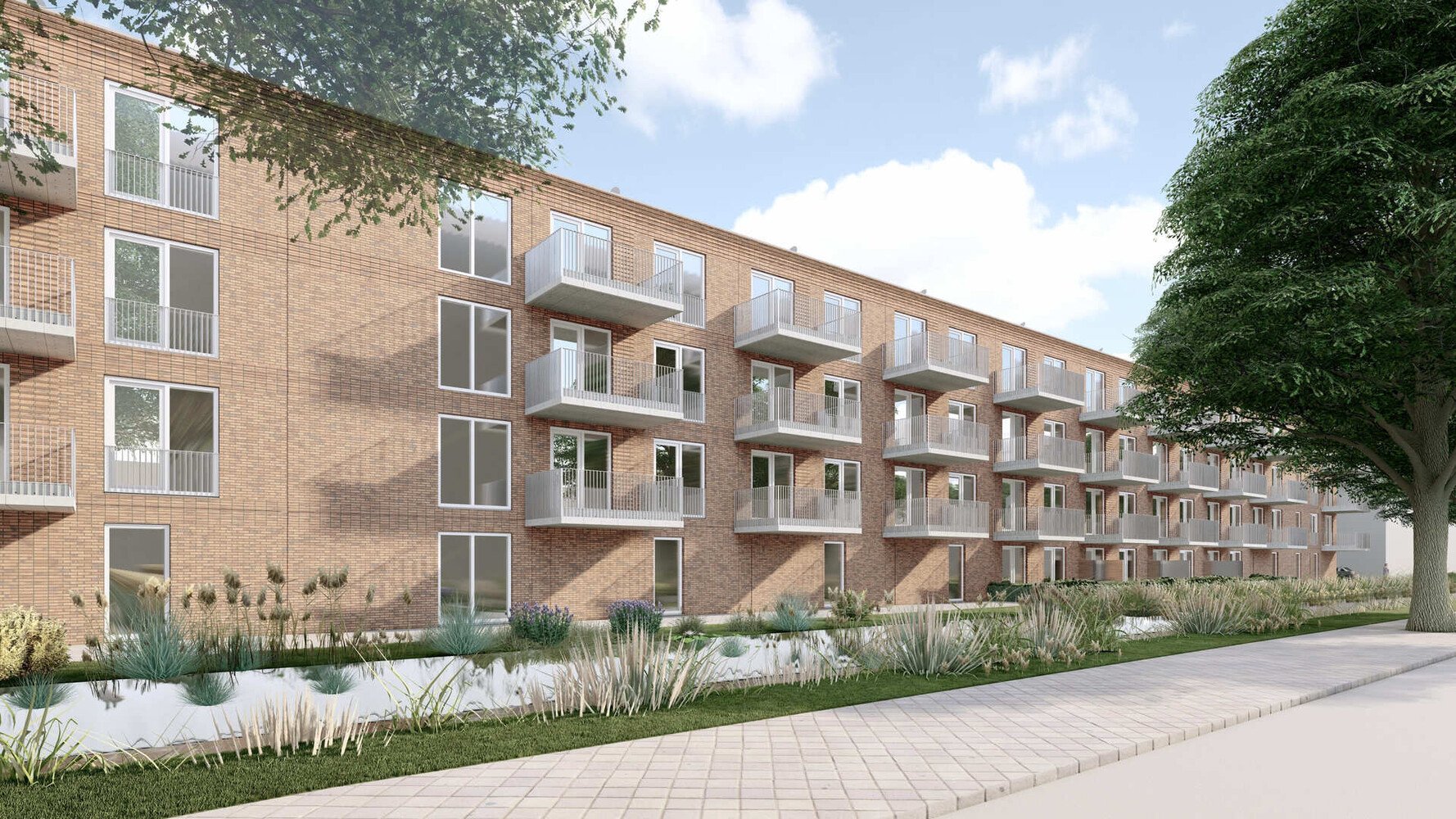 Op deze pagina staan een aantal schetsen van het gebouw. Het is een voorbeeld en bedoeld om u een indruk te geven van de woningen en de omgeving. Let niet te veel op de kleuren, de indeling en de afwerking van de gevels. Dat kan nog veranderen.