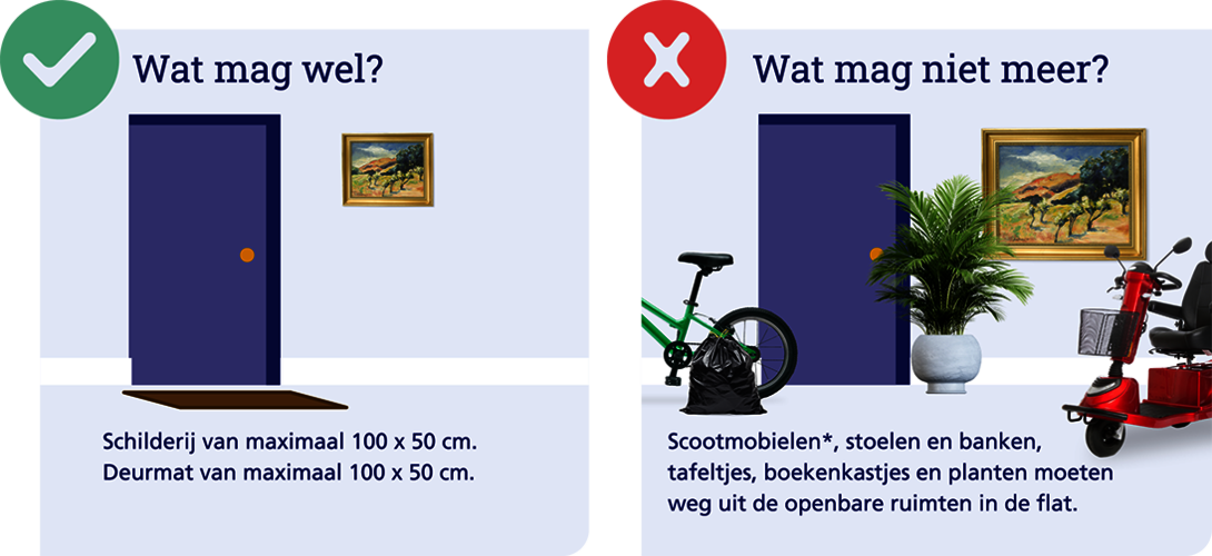 Op de afbeelding hieronder staat welke spullen u wel en niet op de gemeenschappelijke vluchtroutes mag plaatsen. Spullen die hier niet bij staan, zijn niet toegestaan.